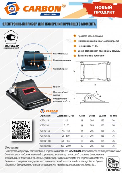 Электронные приборы для измерения крутящего момента Carbon портативного типа предназначены для контроля рабочих значений крутящего момента, по часовой стрелке до момента срабатывания механизма фиксации, установленного на инструменте крутящего момента. Значение измеряемого крутящего момента отобразится на дисплее прибора. Время удержания динамометрического инструмента при фиксации измерения - 2 секунды.