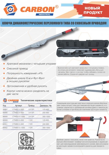 CTWBD-4-1000 Ключ динамометрический переломного типа со сквозным приводом, 3/4"DR, 300-1000 Нм, погрешность пр.+/-4% Carbon