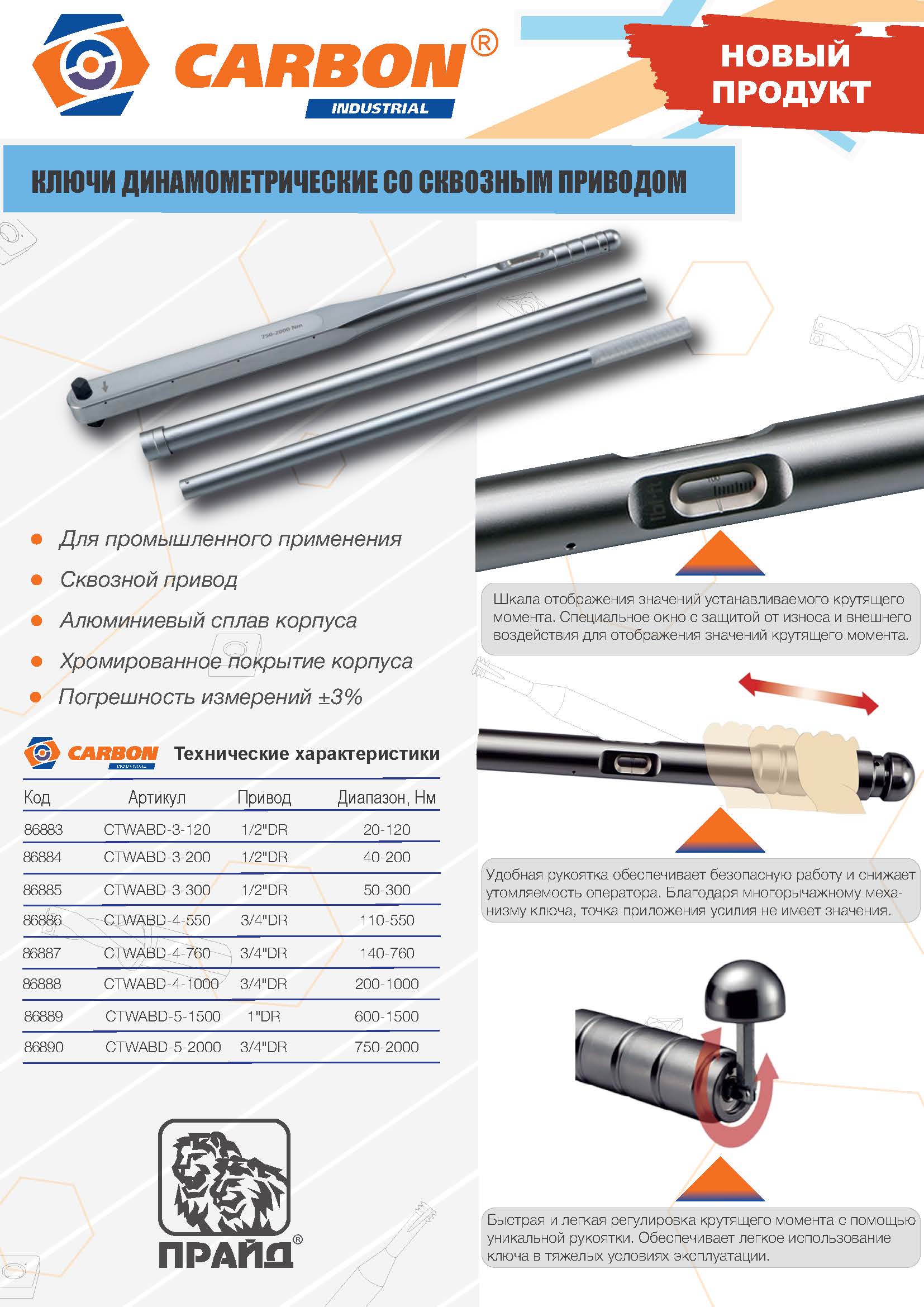 CTWABD-4-1000 Ключ динамометрический алюминиевый со сквозным приводом, 3/4"DR, 200-1000 Нм, погрешность пр.+/-3% Carbon